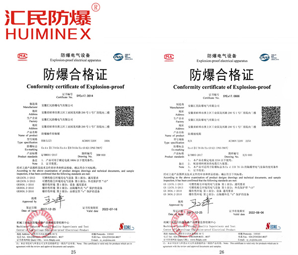 产品合格证书:仅仅公司自身对防爆电气设备完成检验达标后的一个标示,证实该商品是达标的。